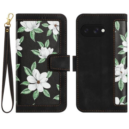 Funda de Cuero con Estampado Floral para Google Pixel 9A con Cordón (Negro)