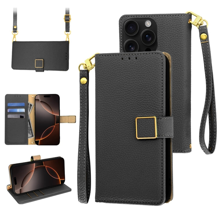 Funda de Cuero con Hebilla Cuadrada y Textura de Lichi Cruzada para iPhone 16 Pro (Negro)