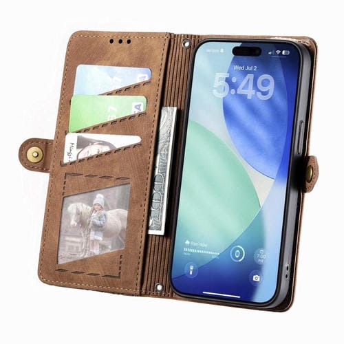Funda de cuero con hebilla lateral y cremallera geométrica para iPhone 17 (marrón)