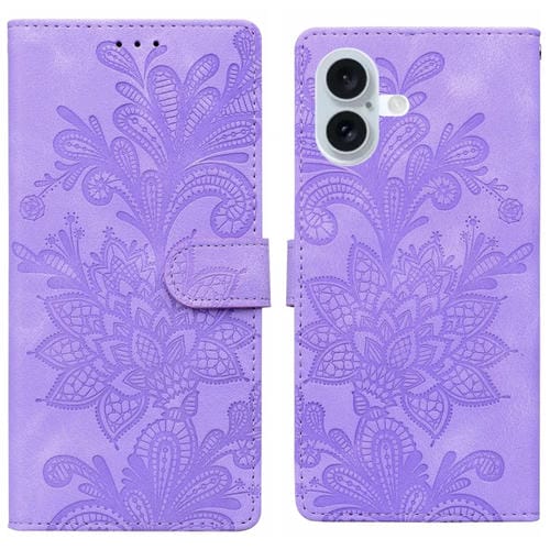 Funda de Cuero para iPhone 16 Plus con Hebilla Magnética y Diseño Floral en Relieve (Morado)