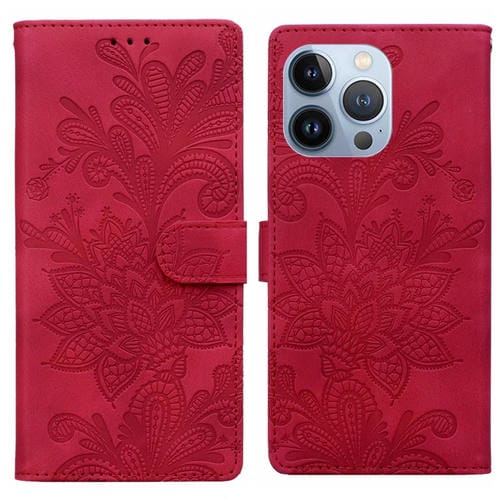 Funda de Cuero con Hebilla Magnética y Encaje Floral para iPhone 14 Pro Max (Rojo)