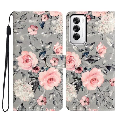 Funda de Cuero con Patrón 3D para Teléfono Oppo Reno12 Global (Flor de Base Gris)