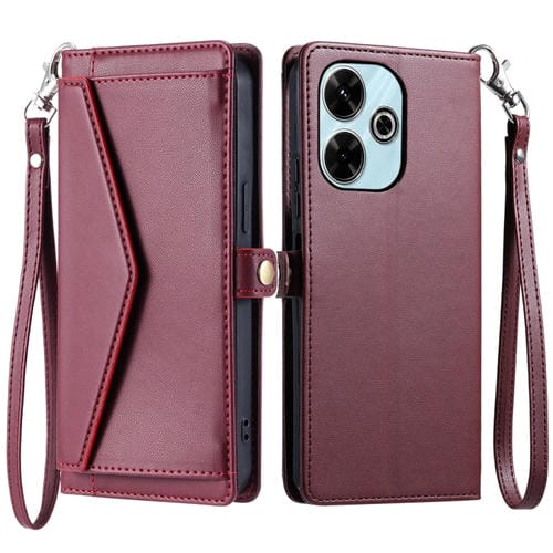 Funda de Cuero con Ranura para Múltiples Tarjetas para Redmi 13 4G con Cordón (Rojo Vino)