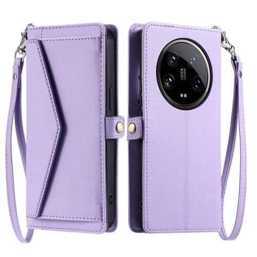 Funda De Cuero Con Ranura Para Múltiples Tarjetas Y Cordón Para Xiaomi 14 Ultra 5G (Morado)