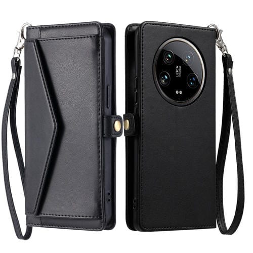 Funda De Cuero Con Ranura Para Múltiples Tarjetas Y Cordón Para Xiaomi 14 Ultra 5G (Negro)