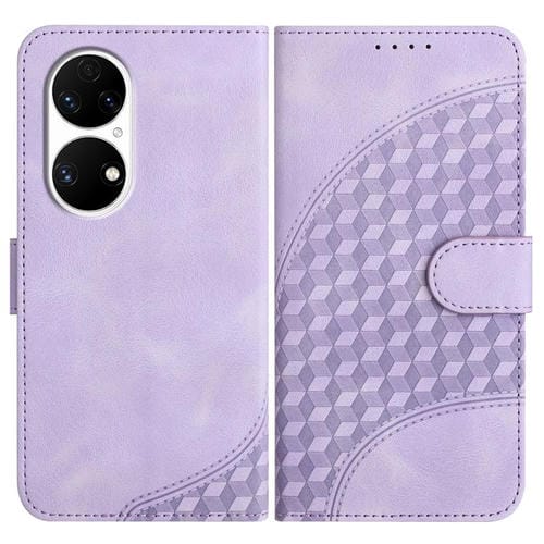 Funda de Cuero Huawei P50 con Relieve de Cabeza de Elefante y Cordón (Morado Claro)