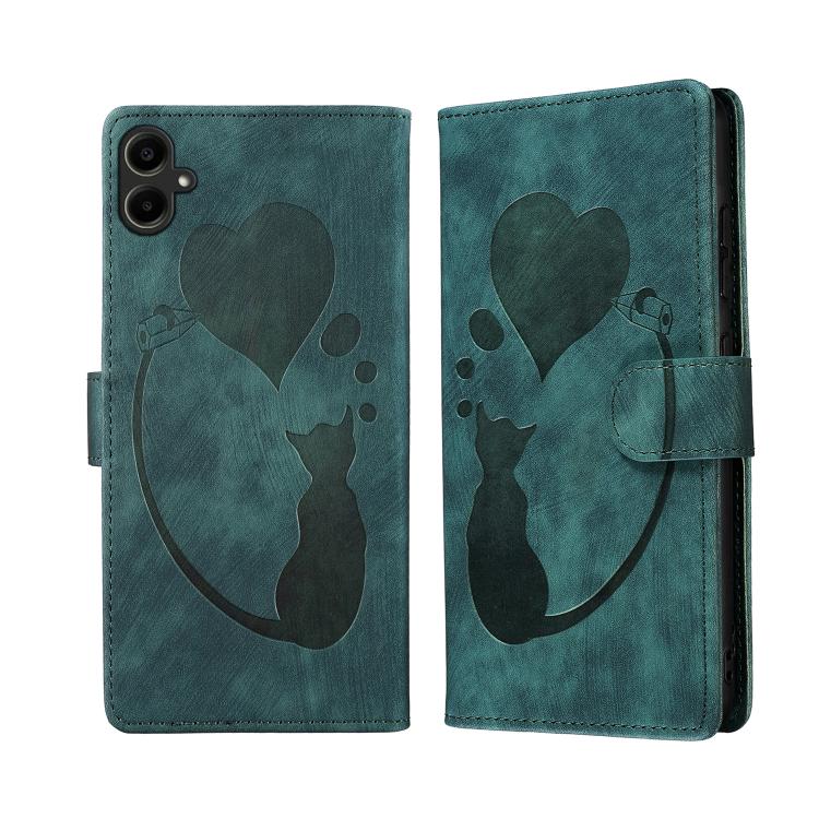 Funda de cuero con relieve de gato y corazón para Samsung Galaxy A07 4G / A06 4G (verde)