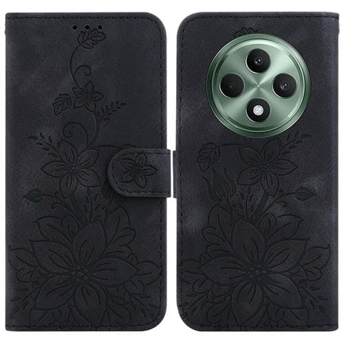Funda de Cuero con Relieve de Lirio para Oppo Reno12 F 5G (Negra)