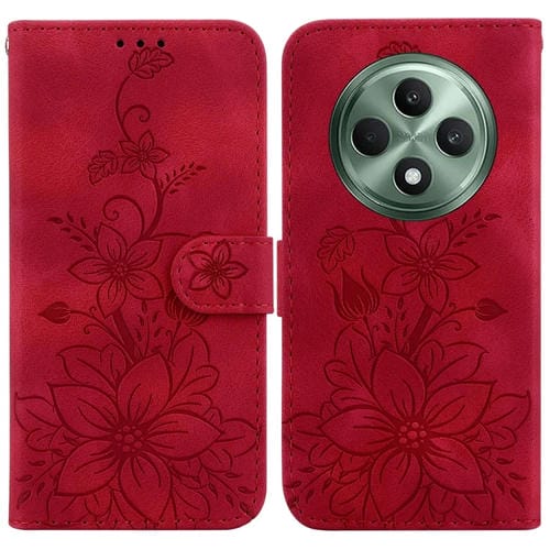 Funda de Cuero con Relieve de Lirio para Oppo Reno12 F 5G (Roja)