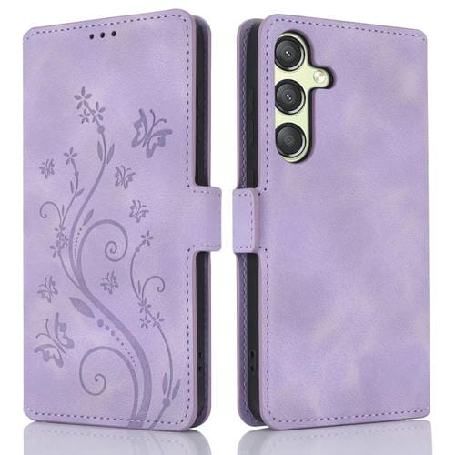Funda de Cuero Samsung Galaxy A25 5G Global Dreamy Relieve Mariposa y Flor de Amor (Morado)