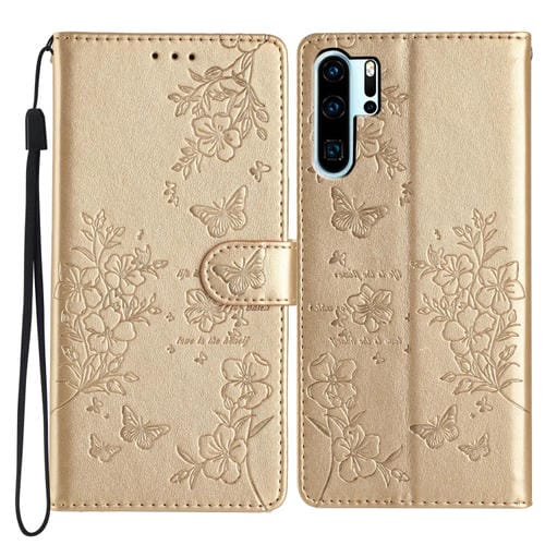 Funda de Cuero con Relieve Mariposa y Flor para Huawei P30 Pro (Dorada)
