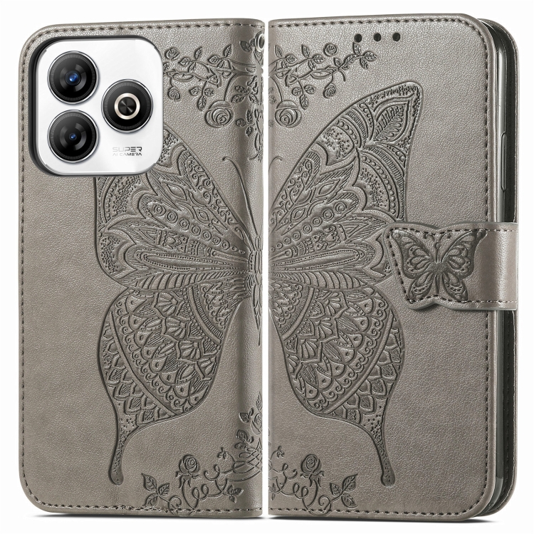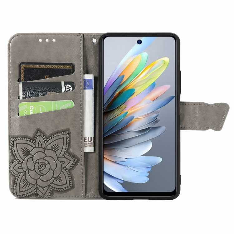 Funda de Cuero con Relieve Mariposa y Flor para ZTE Blade A75 4G (Gris)