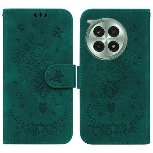 Funda de Cuero con Relieve Mariposa y Rosa para OnePlus Ace 3 Pro (Verde)