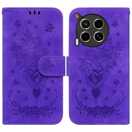 Funda de Cuero con Relieve Mariposa y Rosa para Tecno Camon 30 4G/5G (Morado)