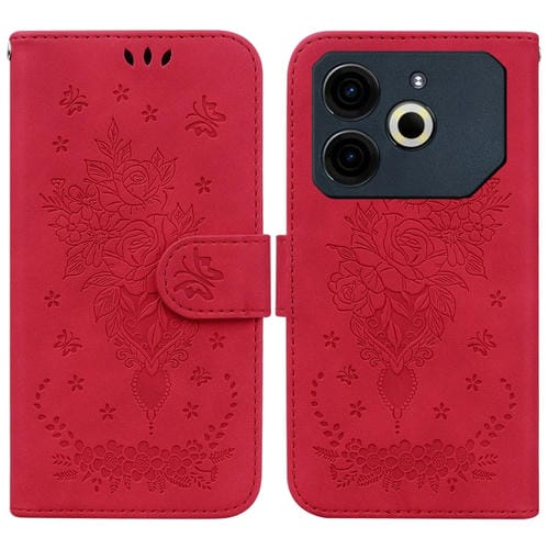 Funda de Cuero para Tecno Pova 6 Neo con Relieve Mariposa y Rosa (Rojo)