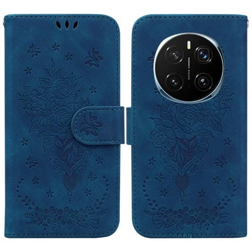 Funda de Cuero con Relieve Mariposa y Rosa para Honor Magic7 Pro (Azul)