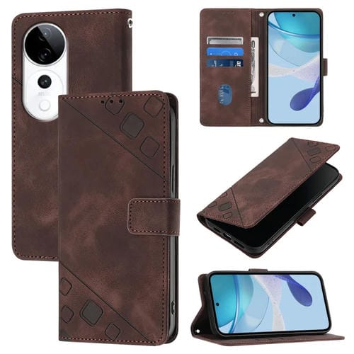 Funda de Cuero con Relieve para Teléfono con Tacto de Piel para Vivo S19 Pro (Marrón)