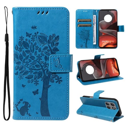Funda de Cuero con Tapa para Motorola Moto G15 con Diseño Árbol y Gato en Relieve (Azul)