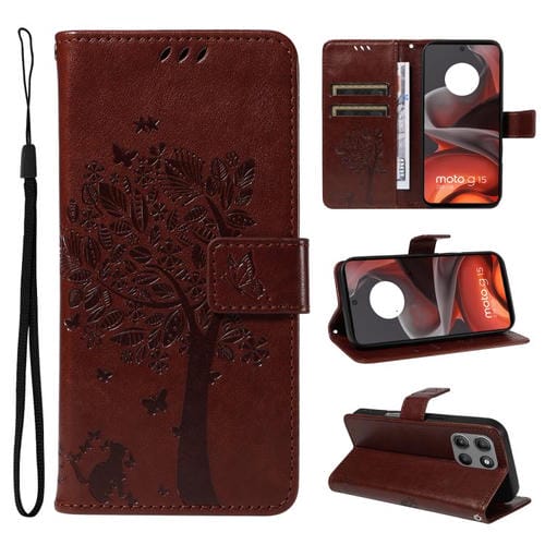 Funda de Cuero con Tapa para Motorola Moto G15 con Diseño de Árbol y Gato en Relieve (Café)