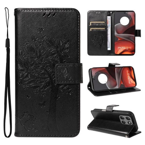 Funda de Cuero con Tapa para Motorola Moto G15 con Diseño de Árbol y Gato en Relieve (Negro)