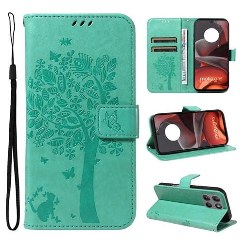 Funda de Cuero con Tapa para Motorola Moto G15 con Diseño Árbol y Gato en Relieve (Verde)