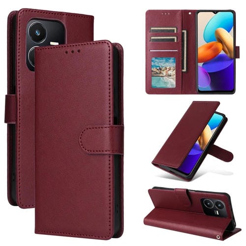 Funda de Cuero con Tapa Horizontal Multifuncional para Vivo Y22S 4G / Y22 4G 2022 con Ranura para Tres Tarjetas (Rojo Vino)