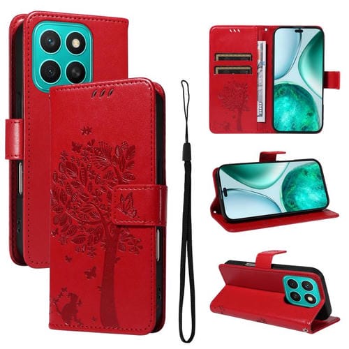 Funda de Cuero con Tapa para Honor X8C 4G Global con Estampado de Árbol y Gato (Roja)