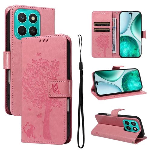 Funda de Cuero con Tapa para Honor X8C 4G Global con Estampado Árbol y Gato (Rosa)