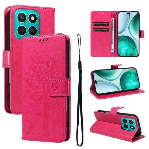 Funda de Cuero con Tapa para Honor X8C 4G Global con Estampado de Árbol y Gato (Rosa Rojo)