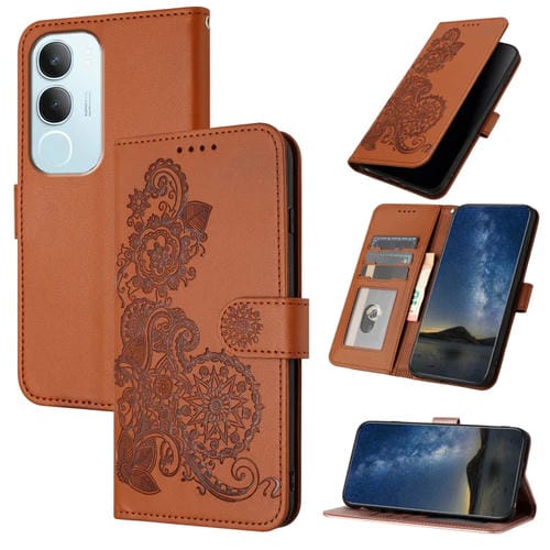 Funda de Cuero con Tapa para Teléfono con Relieve de Flor de Datura para Vivo Y19S Global (Marrón)