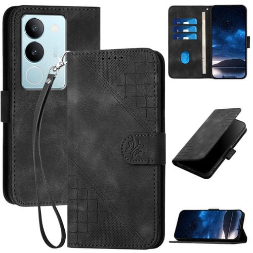 Funda de Cuero con Tapa y Cordón para Vivo V29 Pro Yx0080 con Diseño En Relieve de Mariposa y Cuadrícula (Negro)