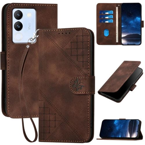 Funda de Cuero con Tapa y Cordón para Vivo V30 Lite 5G Global Yx0080 con Diseño En Relieve de Mariposas y Cuadrícula (Café)