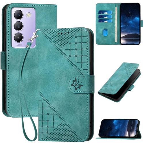 Funda de Cuero con Tapa y Cordón para Vivo Y100 5G Idn Yx0080 con Diseño En Relieve de Mariposa y Cuadrícula (Azul Claro)