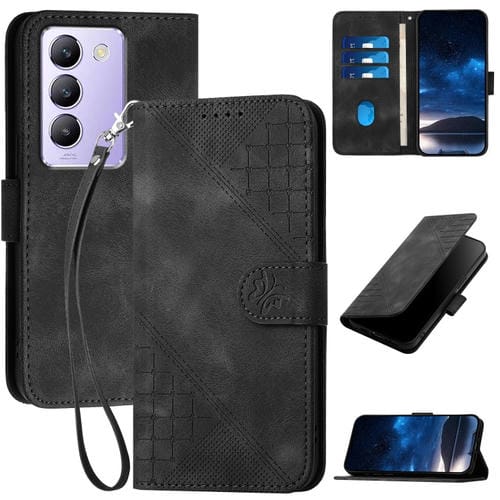 Funda de Cuero con Tapa y Cordón para Vivo Y200E 5G Global Yx0080 con Diseño En Relieve de Mariposa y Cuadrícula (Negro)