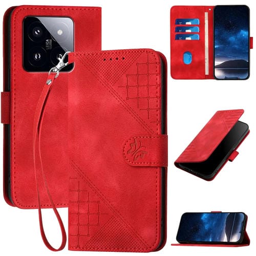 Funda De Cuero Con Tapa Y Cordón Para Xiaomi 14 Pro Yx0080 Con Diseño En Relieve De Mariposa Y Cuadrícula (Rojo)