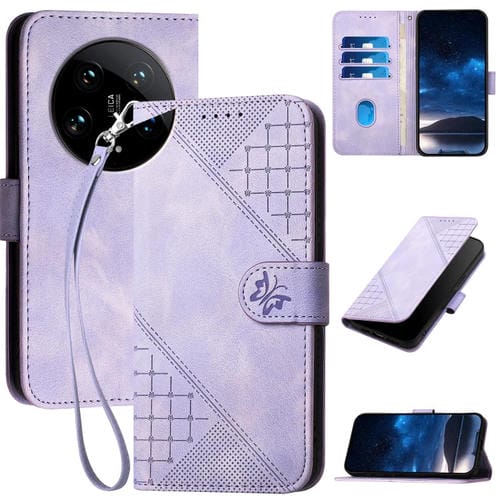 Funda De Cuero Con Tapa Y Cordón Para Xiaomi 14 Ultra Yx0080 Con Diseño De Mariposa En Relieve Y Cuadrícula (Morado Claro)