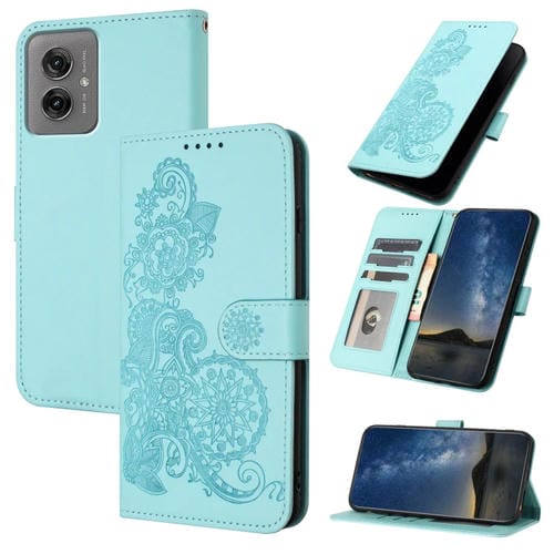 Funda de Cuero con Tapa y Diseño de Flor de Datura en Relieve para Motorola Moto G55 (Azul Claro)