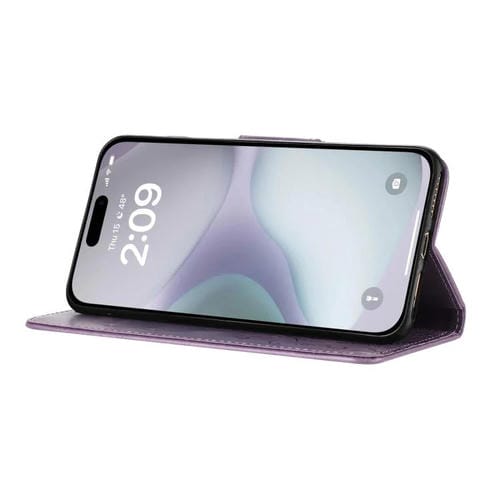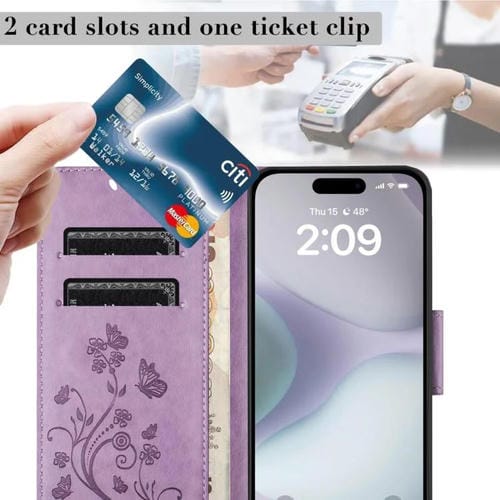 Funda de cuero con tapa y diseño de mariposas y flores para iPhone 17 (morado claro)