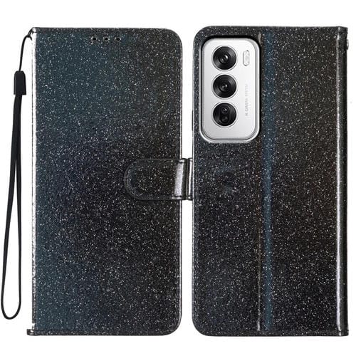 Funda de Cuero con Tapa y Purpurina para Oppo Reno12 Global (Negra)