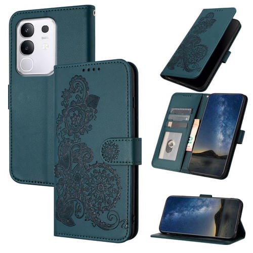 Funda de Cuero con Tapa y Relieve de Flor de Datura para Vivo Y29 4G (Verde Oscuro)
