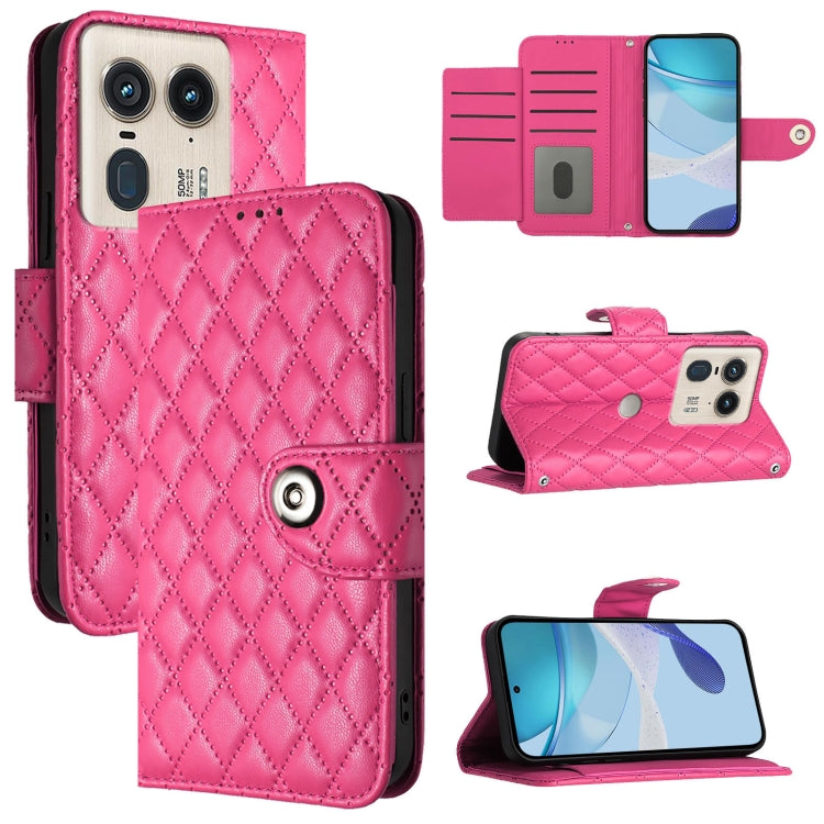 Funda de Cuero con Tapa y Textura Rombal para Motorola Edge 50 Ultra con Cordón (Rosa y Rojo)