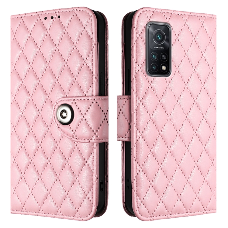 Funda de Cuero con Tapa y Textura Rómbica para Xiaomi Mi 10T/10T Pro 5G con Cordón (Rosa)