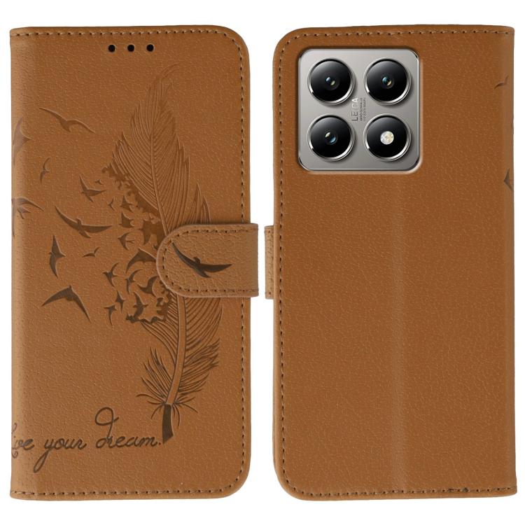 Funda de cuero con textura de lichi y estampado de plumas para Xiaomi 14T (marrón)