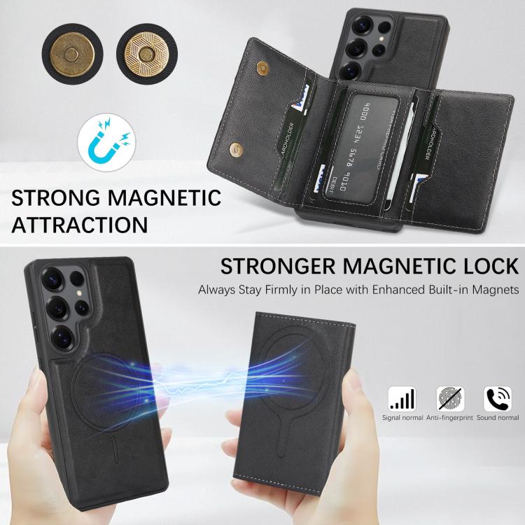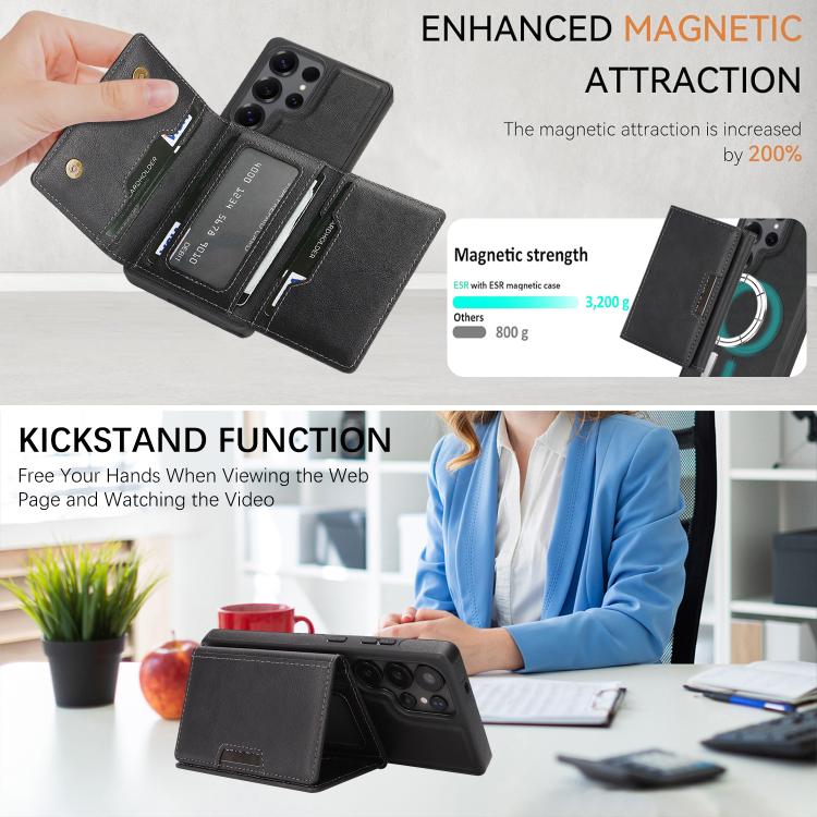 3. Funda de cuero multifuncional y elegante. Tanto la funda como el tarjetero están hechos de un imán de anillo N52 de alto rendimiento, que se puede desmontar y montar gracias a su potente magnetismo.