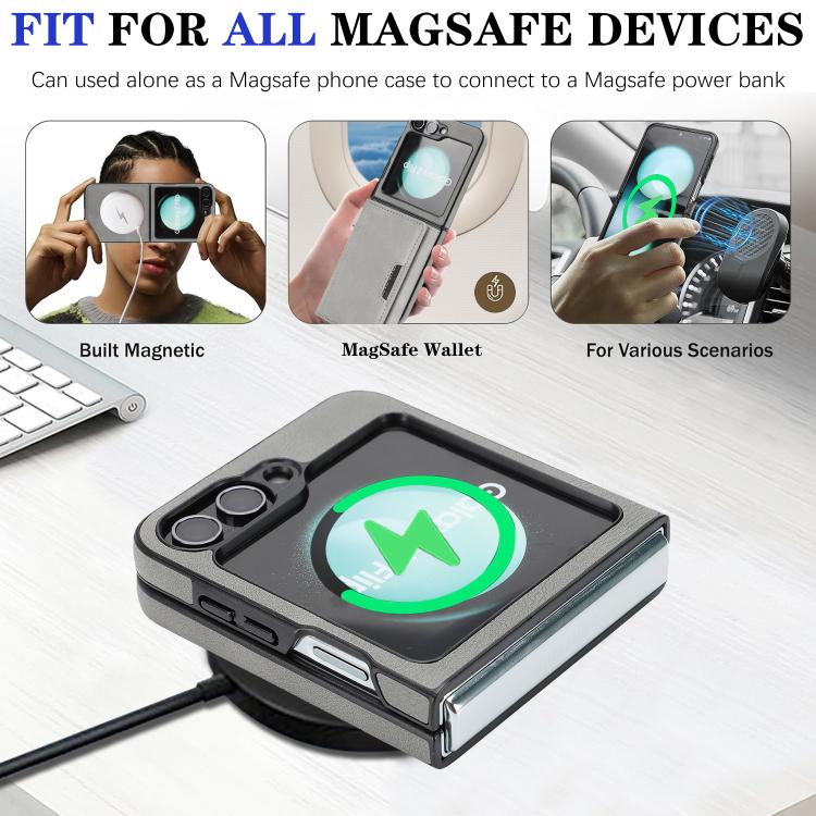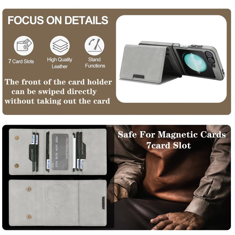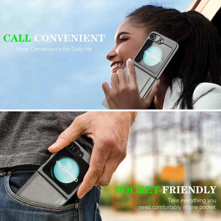 Funda de cuero con tres pliegues y adhesivo lateral para Samsung Galaxy Z Flip6 (gris)