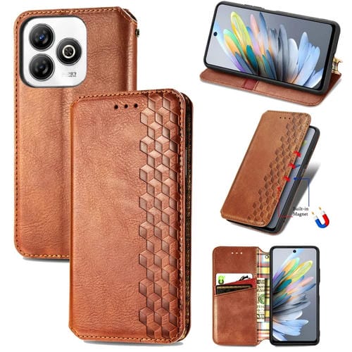 Funda de Cuero Magnética para ZTE Blade A75 4G con Diseño de Cuadrícula Cúbica (Marrón)