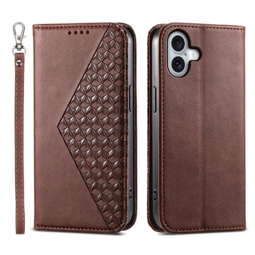 Funda de Cuero Magnética iPhone 16 Plus Textura de Becerro y Cuadrícula Cúbica (Marrón)