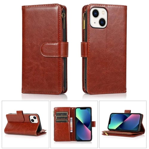 Funda de Cuero para iPhone 14 Multifuncional con 9 Ranuras para Tarjetas (Marrón)
