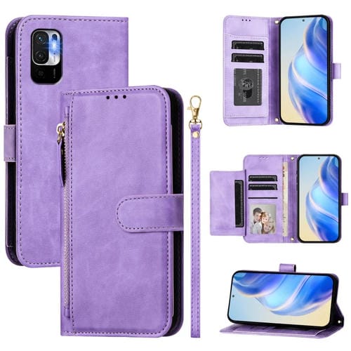 Funda de Cuero para Teléfono con Cremallera y Ranuras para Múltiples Tarjetas para Redmi Note 10 5G/Note 10T 5G (Morado)