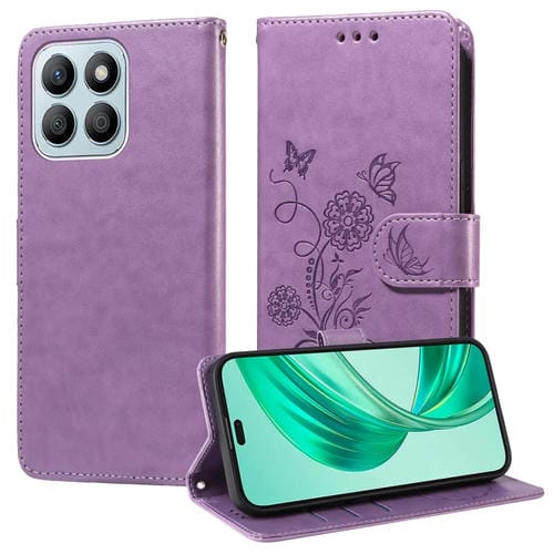 Funda de Cuero para Honor X8B con Diseño de Flores y Mariposa en Relieve (Morado)